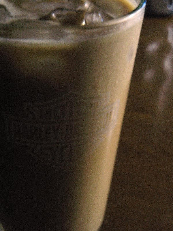 Harley-Davidson のロゴ入りグラスに注がれたカフェオレは、